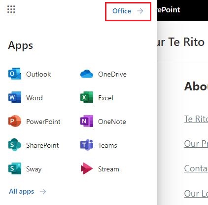 Once the app launcher opens, click on the Office link in the top right hand corner (this will open a new tab in your browser)