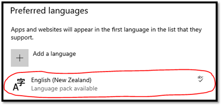 3. Under Preferred languages on the language settings screen, check if you are using the ‘English (New Zealand)’ language setting.