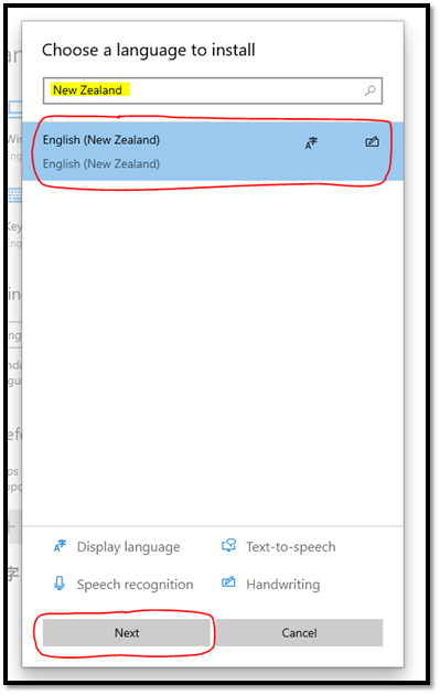 5. Type in ‘New Zealand’ into the search bar and select ‘English (New Zealand)’ and then ‘next’.