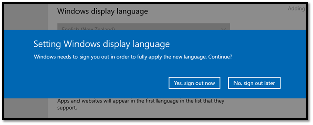 7. It will start to install the new language and will come up a message saying it needs to sign you out of your account in order to apply the change. Make sure you save anything you are working on and then come back to this message and select “Yes, sign out now”.